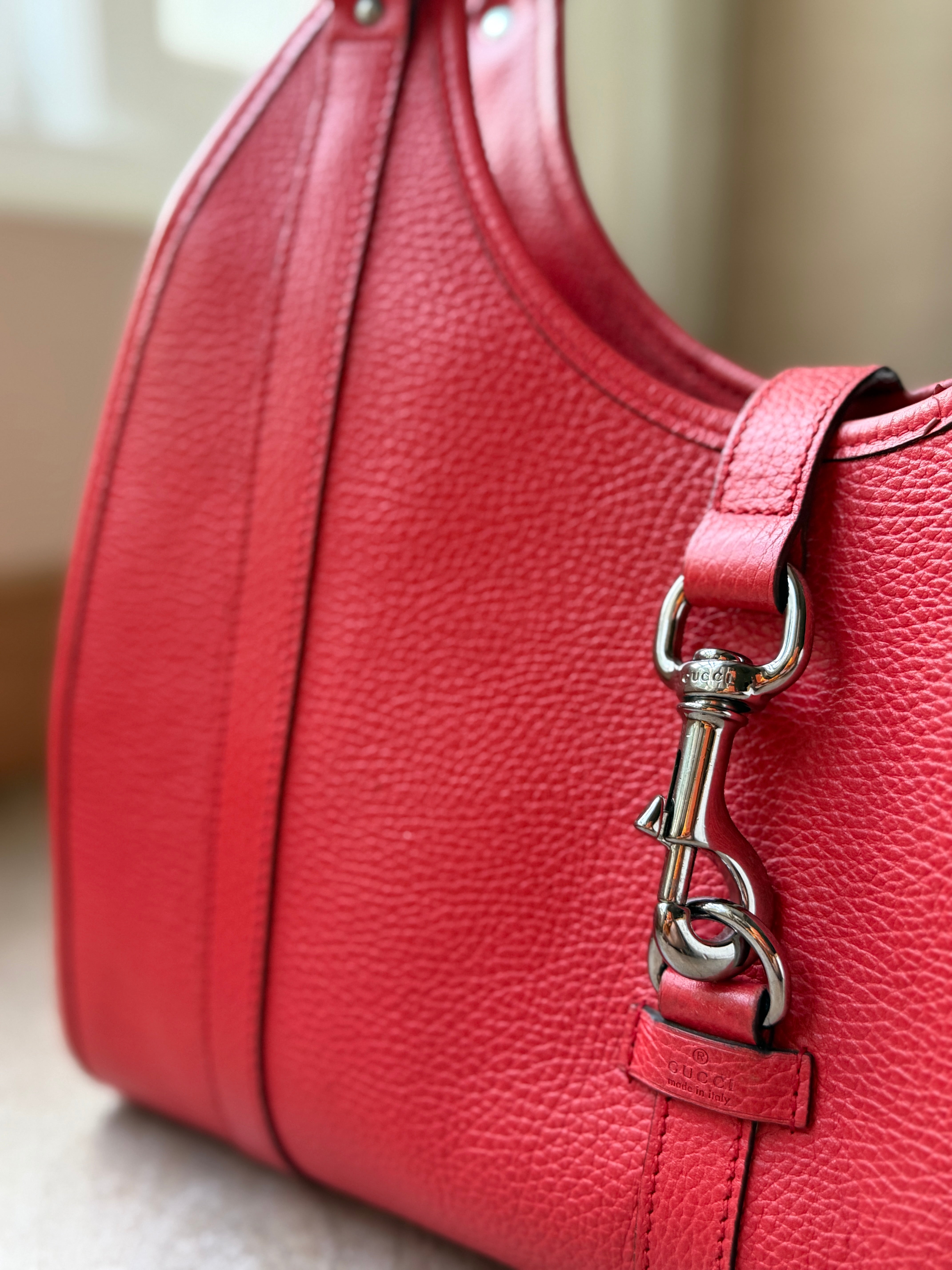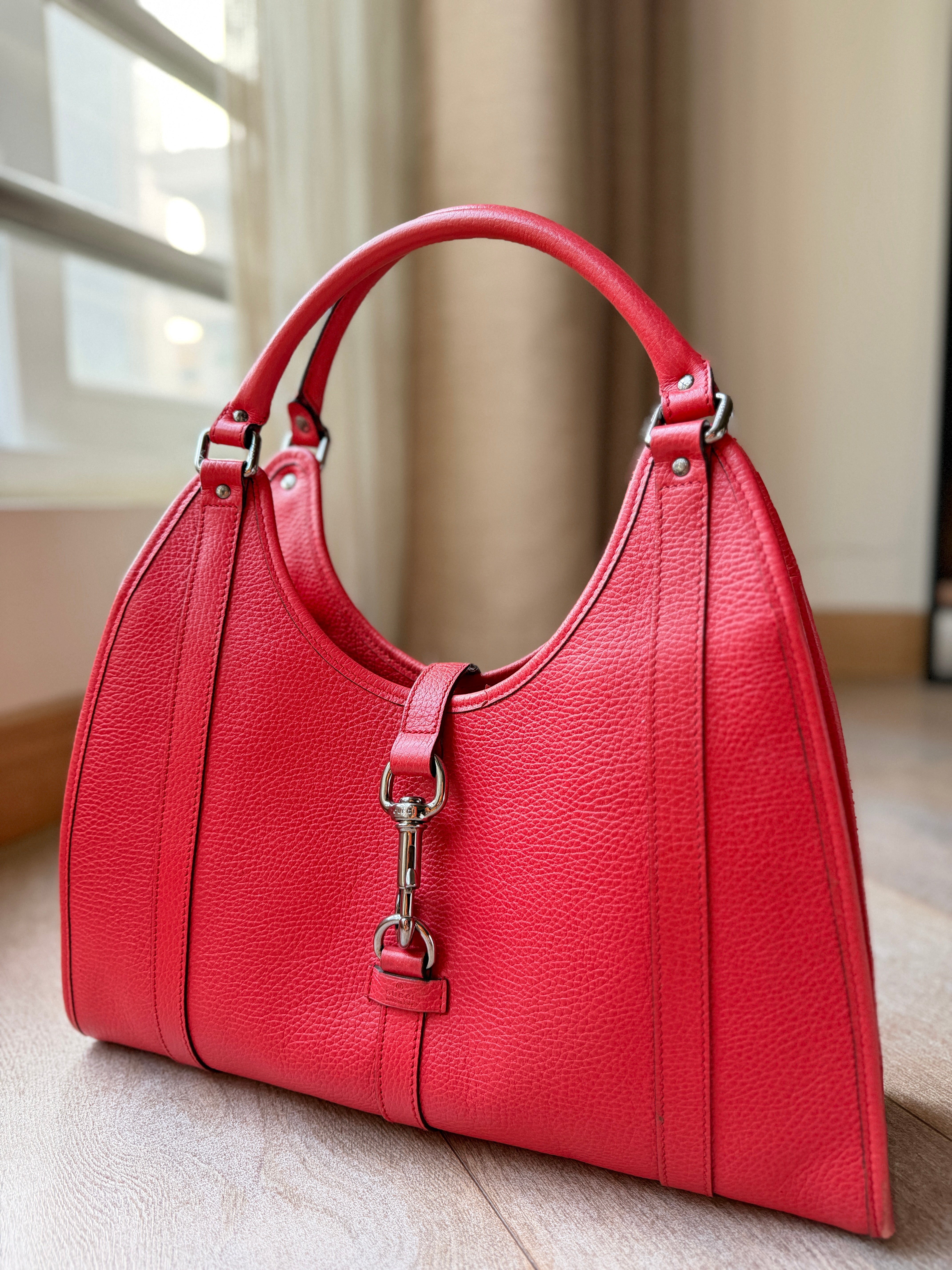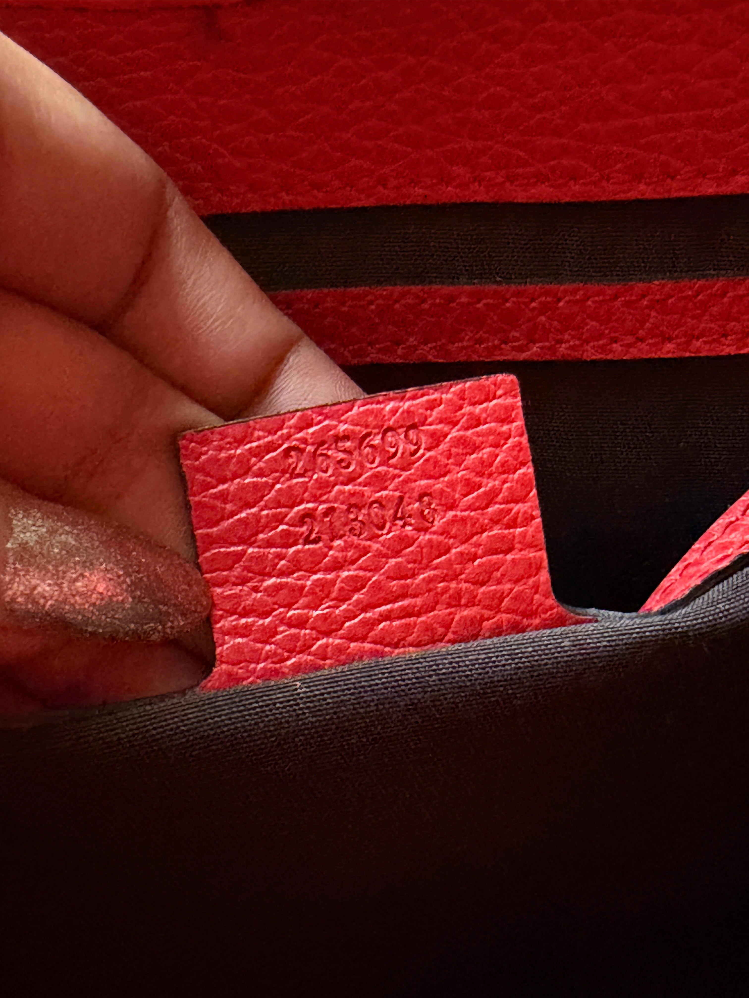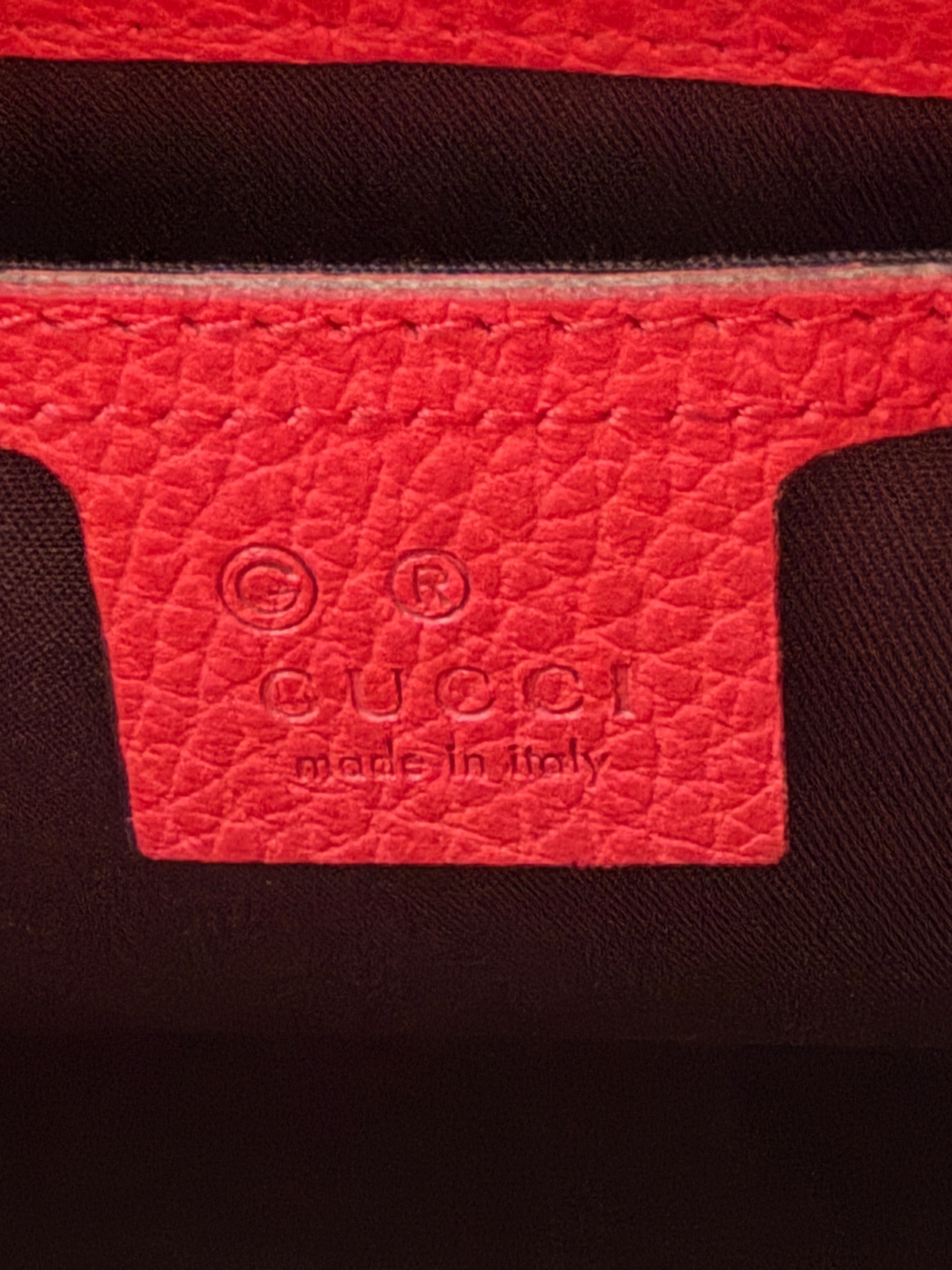 This distinctive bag features a triangle shape with a matte finish, crafted from patent leather that blends playful charm with refined elegance. Part of the Gucci Love collection, it is presented in a vibrant orange hue. The front is accented with a sleek silver hook design, adding a contemporary touch. The bag includes one main compartment with a small inside pocket for organization. A brand label is discreetly placed inside, and it is finished with a small handle for easy carrying. The top features a secure zip closure, ensuring functionality.
