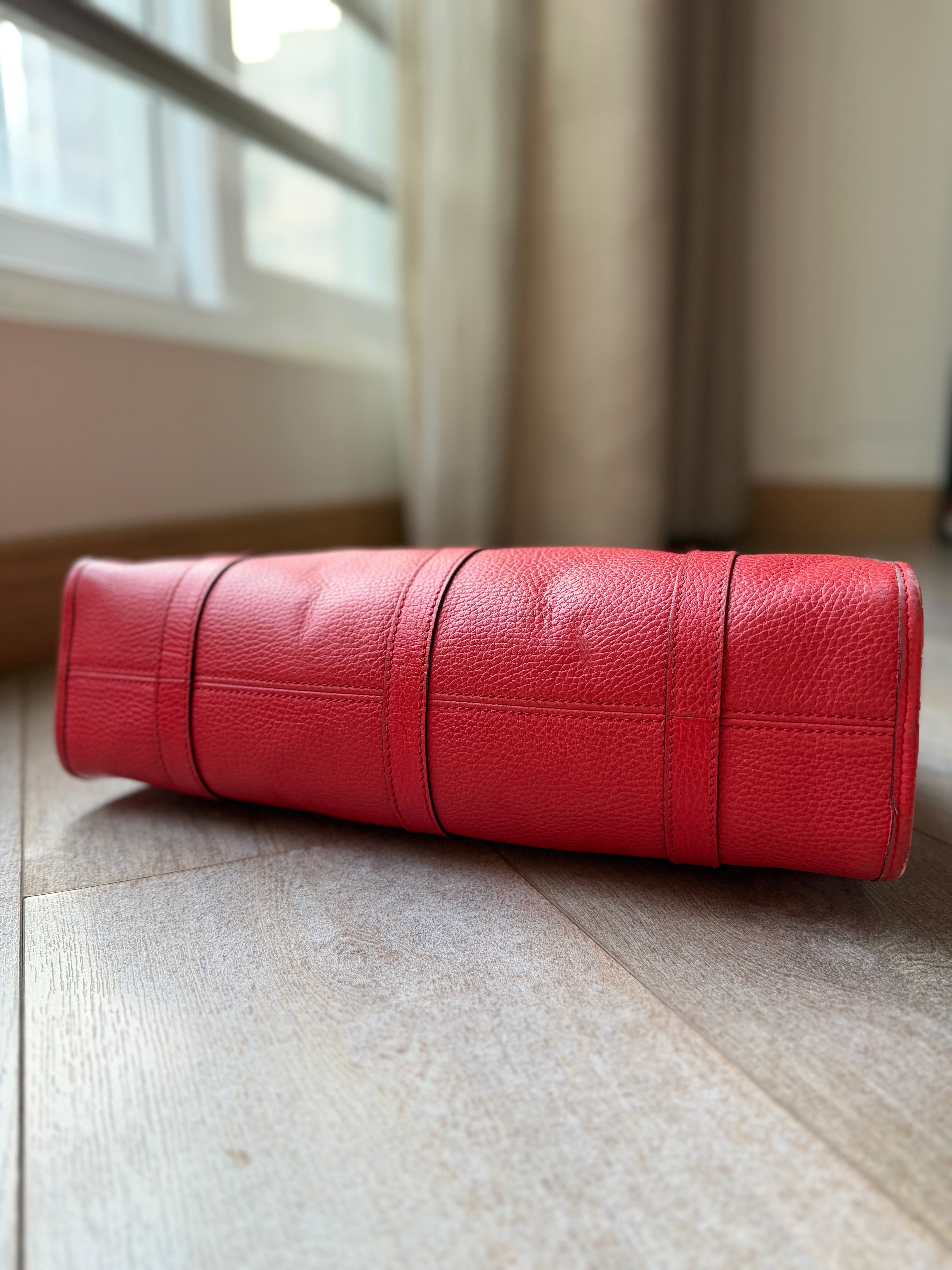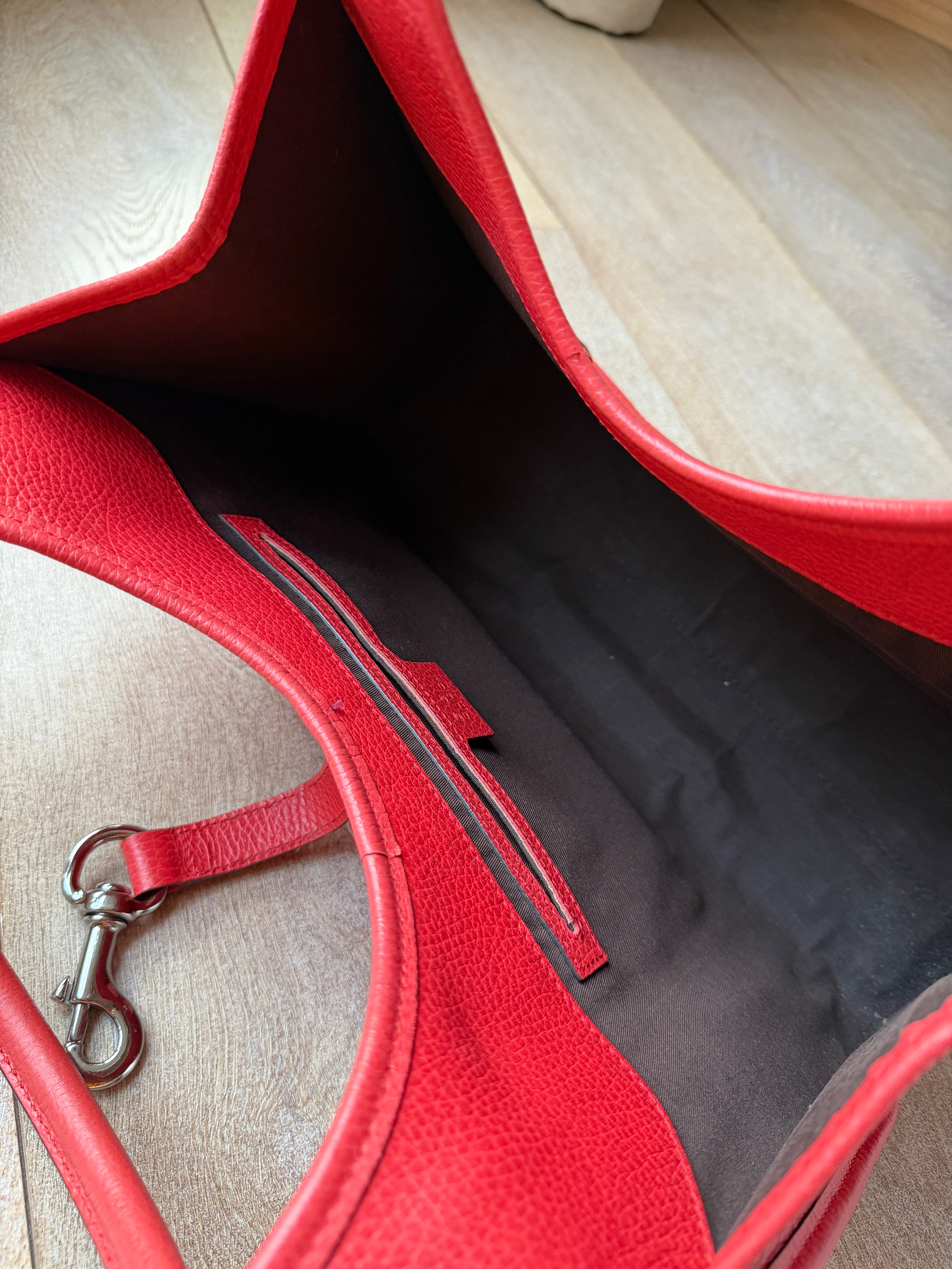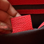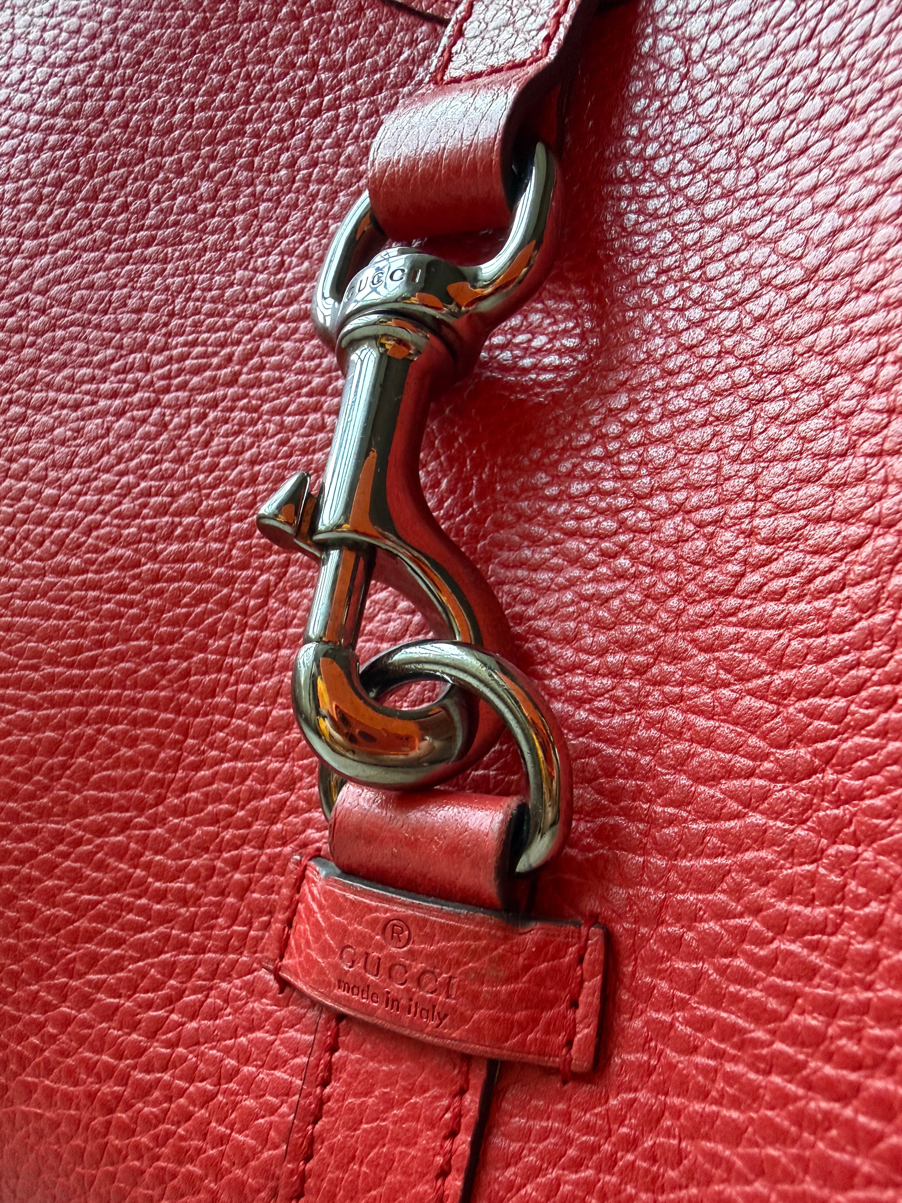 This distinctive bag features a triangle shape with a matte finish, crafted from patent leather that blends playful charm with refined elegance. Part of the Gucci Love collection, it is presented in a vibrant orange hue. The front is accented with a sleek silver hook design, adding a contemporary touch. The bag includes one main compartment with a small inside pocket for organization. A brand label is discreetly placed inside, and it is finished with a small handle for easy carrying. The top features a secure zip closure, ensuring functionality.
