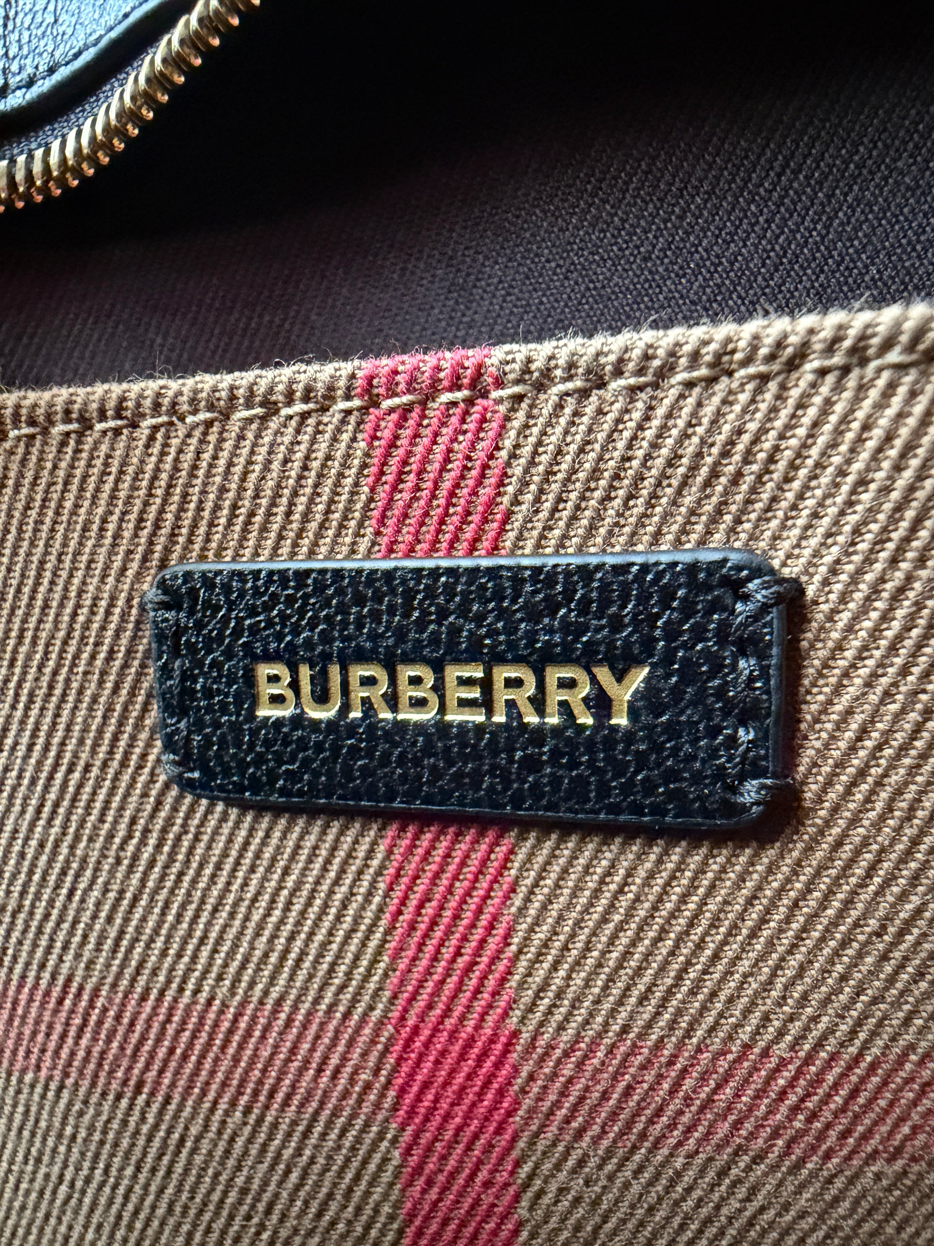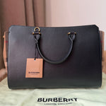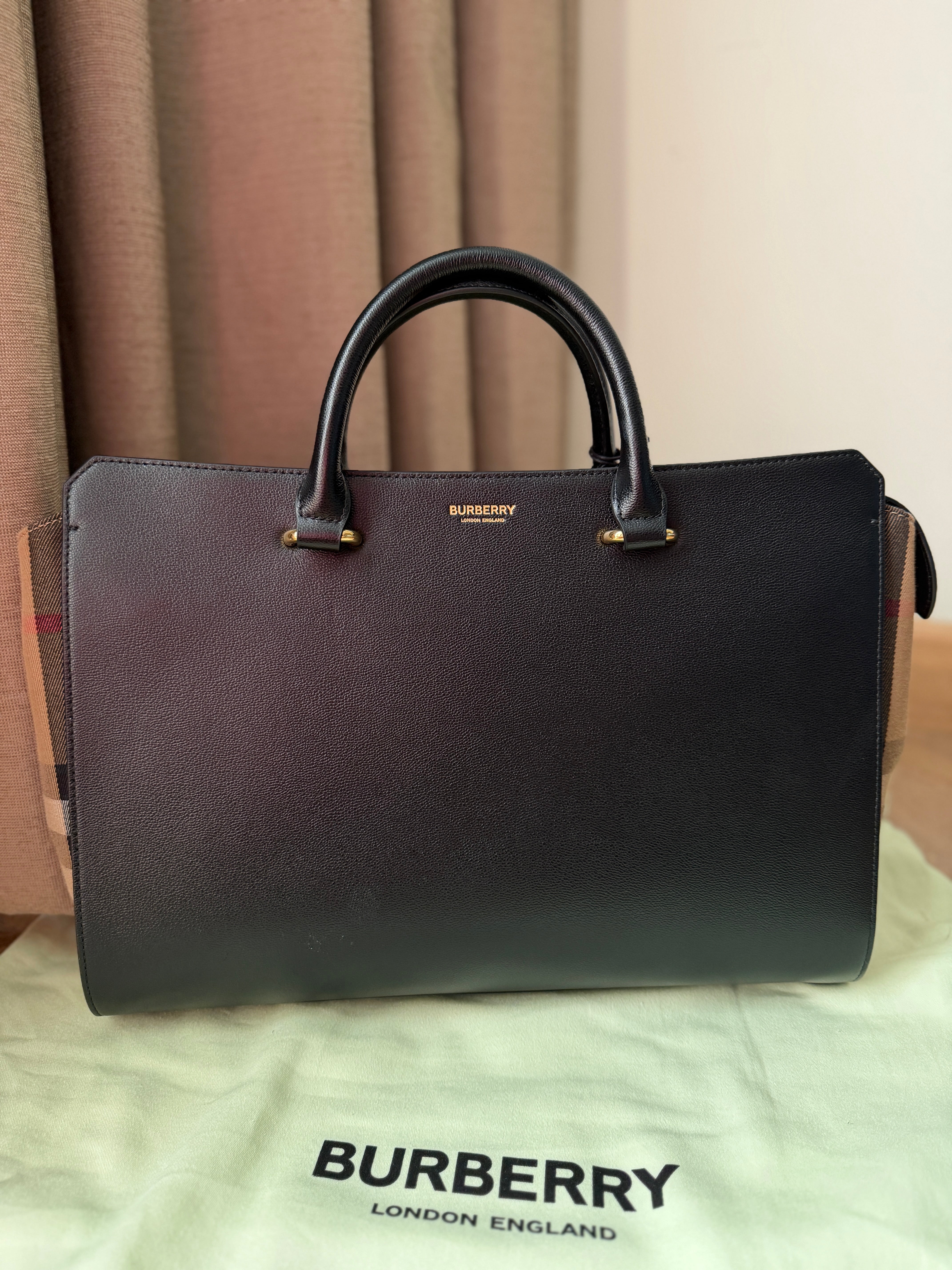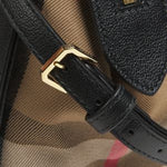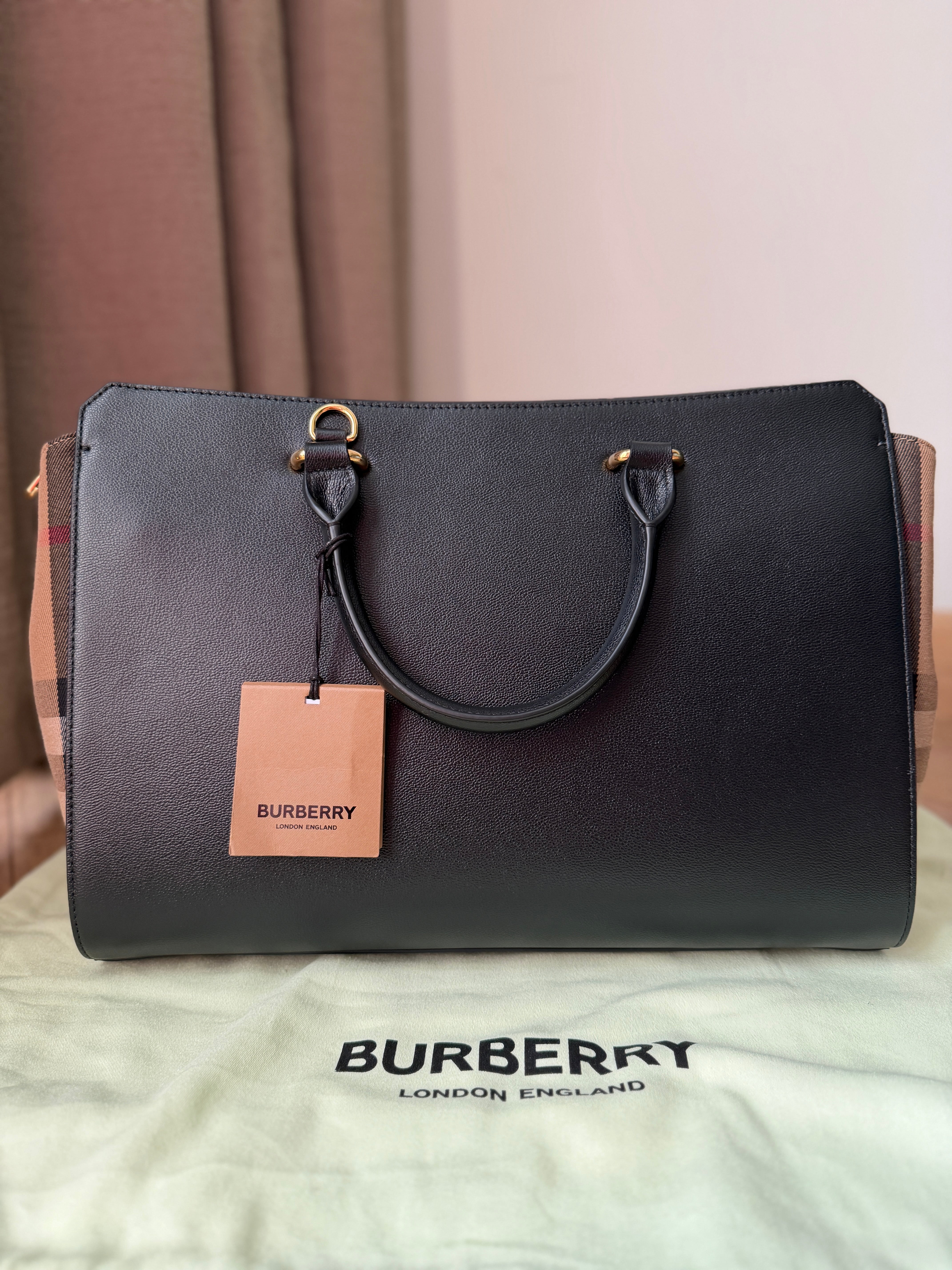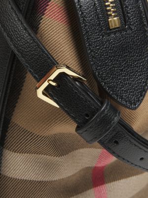 This structured satchel from Burberry pairs smooth leather with the brand’s iconic checked cotton panels. Designed with rolled top handles, a detachable strap, and protective metal feet, the compact silhouette secures with a top zip closure and includes an open interior pocket.