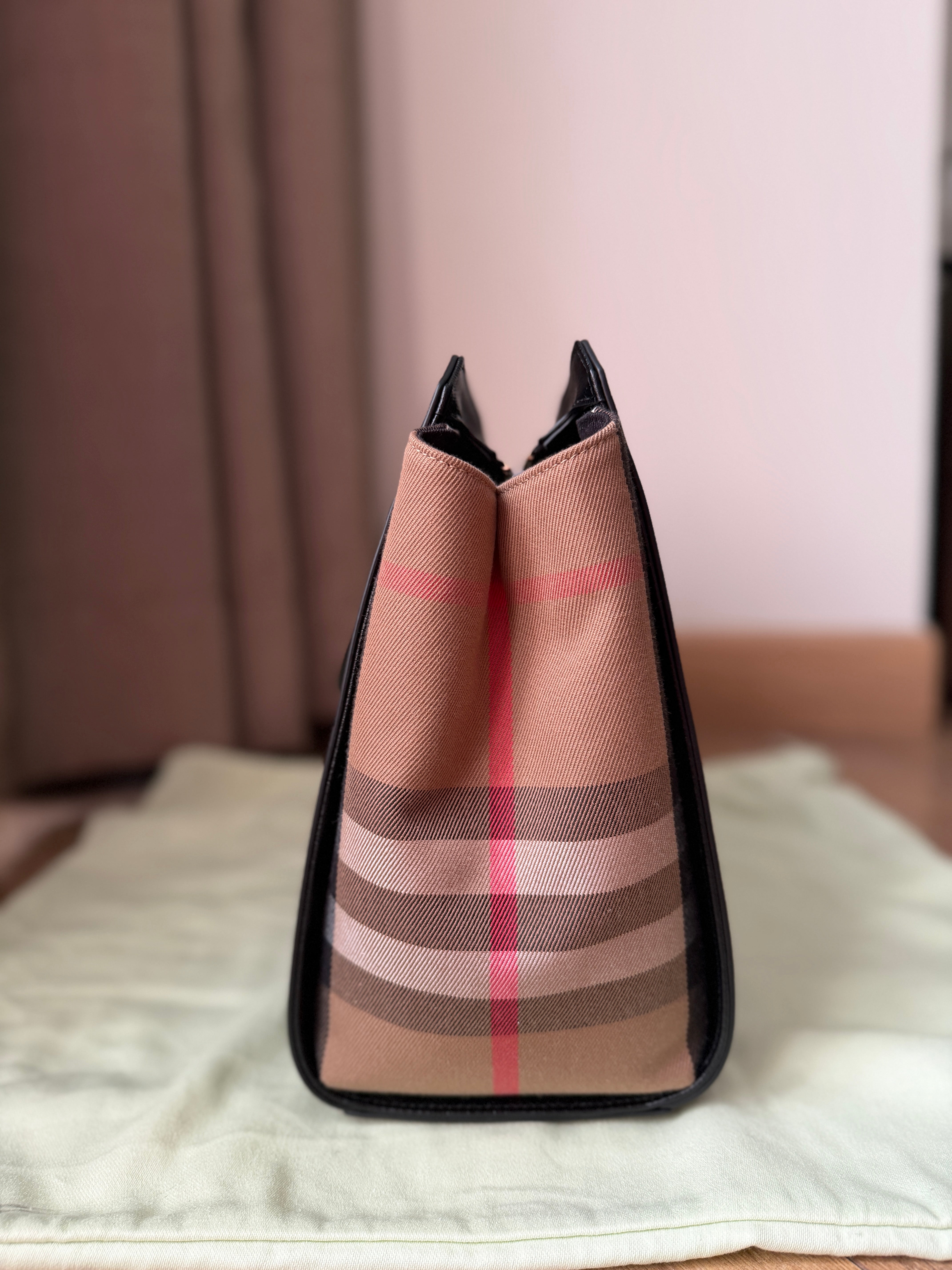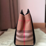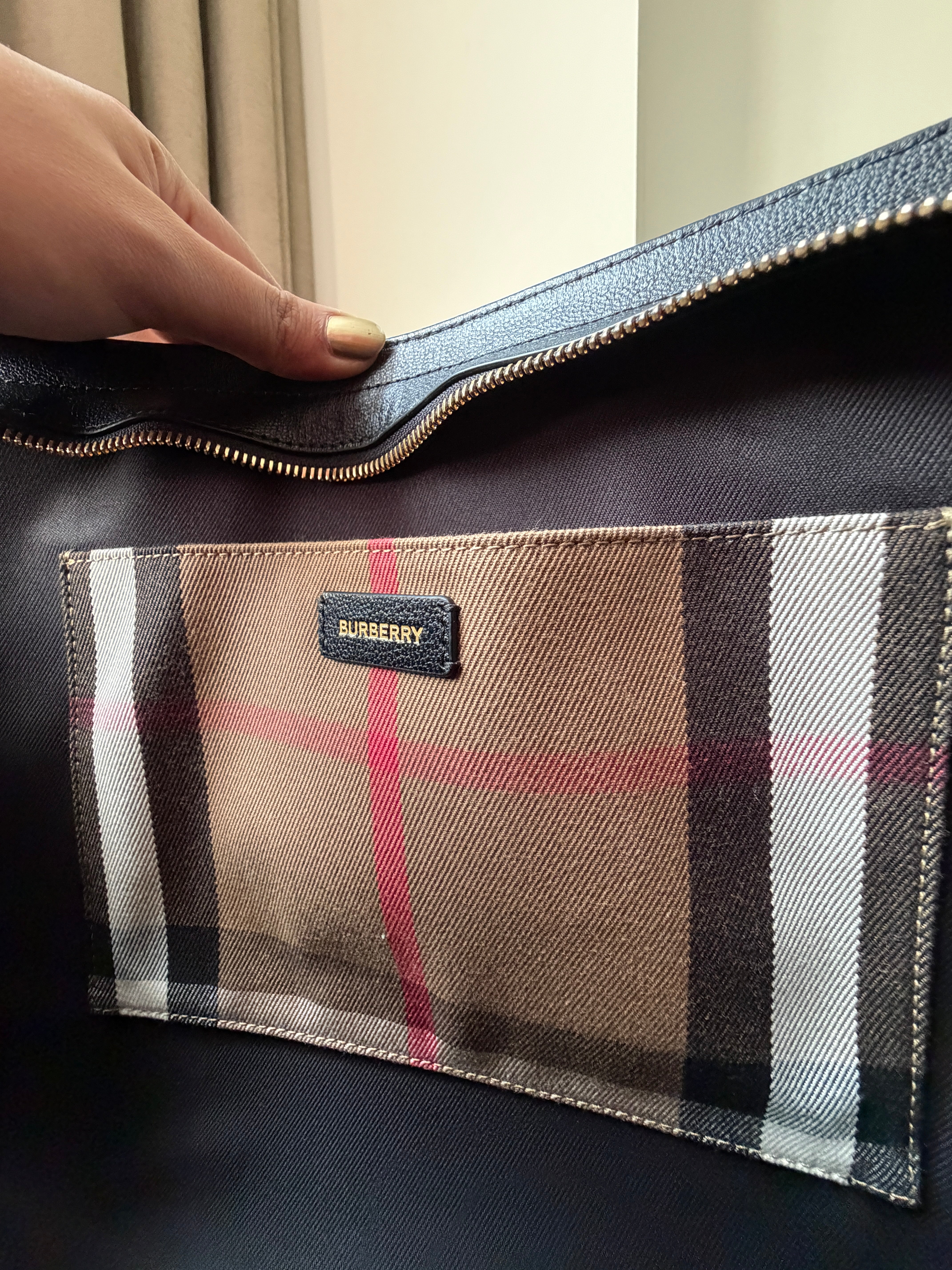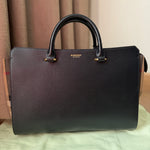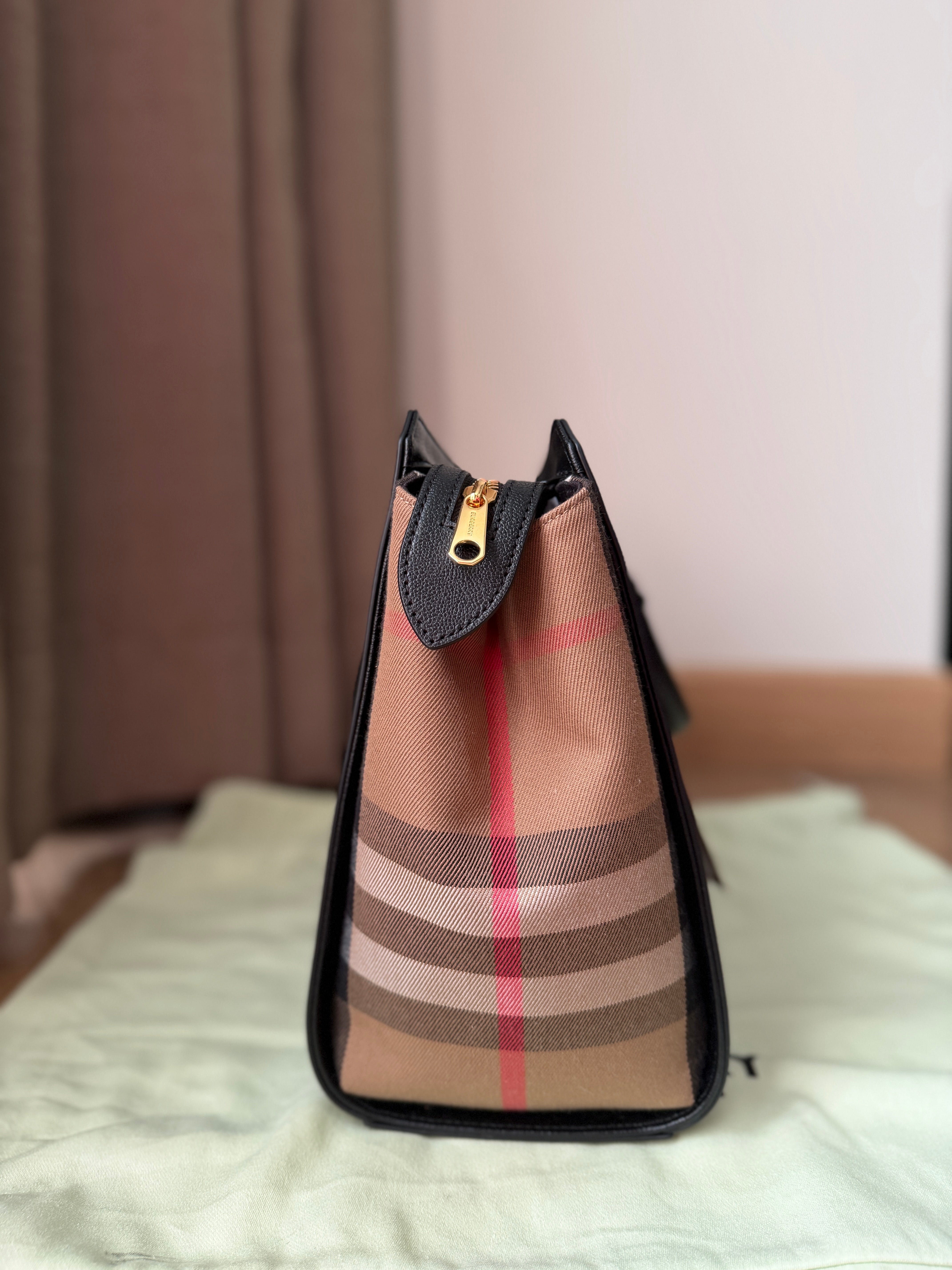 This structured satchel from Burberry pairs smooth leather with the brand’s iconic checked cotton panels. Designed with rolled top handles, a detachable strap, and protective metal feet, the compact silhouette secures with a top zip closure and includes an open interior pocket.